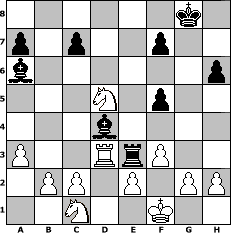 game notation in PGN-format [Event "Eine zentrale Er"] [Site "www.myChess.de"] [Date "2009.05.20"] [Round "2"] [White "Andreas"] [Black "murphy12"] [ECO "C65"] [WhitemyELO "1544"] [BlackmyELO "1596"] [Result "1/2-1/2"] [TimeControl "10/2592000"] [WhiteDays "88"] [BlackDays "90"] [MyChessNo "55959"] 1. e4 e5 2. Nf3 Nc6 3. Bb5 Nf6 4. Nc3 Bc5 5. O-O d6 6. d4 exd4 7. Bxc6+ bxc6 8. Nxd4 Bd7 9. Re1 O-O 10. Bg5 Rb8 11. Nb3 Bb6 12. Qf3 h6 13. Bxf6 Qxf6 14. Qxf6 gxf6 15. Kf1 Rfe8 16. f3 Re5 17. Rad1 Rbe8 18. Nd2 f5 19. a3 d5 20. exd5 cxd5 21. Rxe5 Rxe5 22. Nb3 Bc8 23. Rxd5 Ba6+ 24. Rd3 Re3 25. Nc1 Bd4 26. Nd5 1/2-1/2 position notation in FEN-format 6k1/p1p2p2/b6p/3N1p2/3b4/P2RrP2/1PP1P1PP/2N2K2 - - - 6 26 Captured white pieces: Captured black pieces: Click on a captured piece in order to display the desired move!