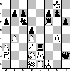 game notation in PGN-format [Event "Schnellschach ohne Engine"] [Site "www.myChess.de"] [Date "2014.02.08"] [Round "1"] [White "Joschi"] [Black "hubi"] [ECO "C13"] [WhitemyELO "1641"] [BlackmyELO "1572"] [Result "0-1"] [TimeControl "10/864000"] [WhiteDays "10"] [BlackDays "10"] [MyChessNo "92794"] 1. e4 e6 2. d4 d5 3. Nc3 Nf6 4. Bg5 Be7 5. exd5 exd5 6. Nf3 O-O 7. Bd3 h6 8. Bh4 Nc6 9. O-O Bg4 10. Be2 Re8 11. h3 Bh5 12. Re1 Ne4 13. Bxe7 Rxe7 14. a3 a6 15. Qd3 Bg6 16. Qd1 Qd6 17. Bd3 Rae8 18. Ne2 Bh5 19. g4 Bg6 20. Nd2 Nxf2 21. Kxf2 Qh2+ 22. Kf1 Bxd3 23. cxd3 Qxh3+ 24. Kf2 Qh2+ 25. Kf1 Re3 26. b4 R8e6 27. Ra2 Rf6+ 0-1 position notation in FEN-format 6k1/1pp2pp1/p1n2r1p/3p4/1P1P2P1/P2Pr3/R2NN2q/3QRK2 - - - 3 28 Captured white pieces: Captured black pieces: Click on a captured piece in order to display the desired move!
