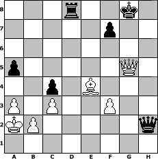 game notation in PGN-format [Event "Mammut"] [Site "www.myChess.de"] [Date "2010.07.01"] [Round "1"] [White "nogumo"] [Black "Grubengeist"] [ECO "B07"] [WhitemyELO "1635"] [BlackmyELO "1918"] [Result "1-0"] [TimeControl "10/2592000"] [WhiteDays "057"] [BlackDays "137"] [MyChessNo "66666"] 1. e4 d6 2. d4 Nf6 3. Nc3 g6 4. Bg5 h6 5. Bxf6 exf6 6. Bc4 Bg7 7. Nge2 O-O 8. Nf4 Kh8 9. O-O Nc6 10. Ncd5 f5 11. exf5 Bxf5 12. c3 Qd7 13. Re1 Rae8 14. Qd2 Ne7 15. Ne3 Be4 16. f3 Bf5 17. g4 b5 18. Bb3 g5 19. Nxf5 Nxf5 20. gxf5 gxf4 21. Qxf4 Rg8 22. Kf2 Rxe1 23. Rxe1 c5 24. Rg1 Qe7 25. Re1 Qf6 26. dxc5 dxc5 27. a3 c4 28. Bc2 Bf8 29. Qe5 Bc5+ 30. Qxc5 Qh4+ 31. Ke2 Qxh2+ 32. Kd1 Rd8+ 33. Kc1 Qd2+ 34. Kb1 Qxe1+ 35. Ka2 a6 36. f6 Qe6 37. Be4 Qxf6 38. Qc7 Kg7 39. Qg3+ Kf8 40. Qf2 h5 41. Qc5+ Kg8 42. Qxh5 Kf8 43. Qc5+ Kg7 44. Qg1+ Kf8 45. Qc5+ Qd6 46. Qg5 Qd2 47. Qh4 a5 48. Qh8+ Ke7 49. Qe5+ Kf8 50. Qxb5 Qh2 51. Qc5+ Kg8 52. Qg5+ 1-0 position notation in FEN-format 3r2k1/5p2/8/p5Q1/2p1B3/P1P2P2/KP5q/8 - - - 4 52 Captured white pieces: Captured black pieces: Click on a captured piece in order to display the desired move!