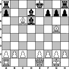 game notation in PGN-format [Event "Es gibt nur eineen Gott BelaFarinRod"] [Site "www.myChess.de"] [Date "2005.03.21"] [Round "1"] [White "Andreas"] [Black "Knight"] [ECO "B33"] [WhitemyELO "1681"] [BlackmyELO "1331"] [Result "1-0"] [TimeControl "10/864000"] [WhiteDays "10"] [BlackDays "10"] [MyChessNo "11373"] 1. e4 c5 2. Nf3 Nc6 3. d4 cxd4 4. Nxd4 Nf6 5. Nxc6 bxc6 6. Bd3 e5 7. O-O d5 8. exd5 Qxd5 9. Nc3 Qe6 10. Bg5 e4 11. Nxe4 Nxe4 12. Bxe4 Bd6 13. Bxc6+ Bd7 14. Re1 Qxe1+ 15. Qxe1+ 1-0 position notation in FEN-format r3k2r/p2b1ppp/2Bb4/6B1/8/8/PPP1PPPP/R3Q1K1 - kq - 0 15 Captured white pieces: Captured black pieces: Click on a captured piece in order to display the desired move!