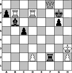 game notation in PGN-format [Event "Dabei ist alles 9"] [Site "www.myChess.de"] [Date "2010.03.22"] [Round "1"] [White "muellerh"] [Black "brucybabe"] [ECO "D02"] [WhitemyELO "1394"] [BlackmyELO "1671"] [Result "1-0"] [TimeControl "10/864000"] [WhiteDays "09"] [BlackDays "10"] [MyChessNo "64211"] 1. d4 d5 2. Nf3 Nf6 3. c4 e6 4. Nc3 Be7 5. Qc2 O-O 6. Bg5 c6 7. e3 Nbd7 8. c5 Qc7 9. Bd3 Re8 10. Ne5 Nxe5 11. dxe5 Qxe5 12. Bxf6 Bxf6 13. Bxh7+ Kf8 14. Bd3 d4 15. Ne4 dxe3 16. fxe3 Qxb2 17. Qxb2 Bxb2 18. Rb1 Be5 19. O-O f5 20. Ng5 Bf6 21. Nh3 g6 22. e4 Bd4+ 23. Kh1 Bxc5 24. g4 Kg7 25. gxf5 exf5 26. exf5 Re3 27. f6+ Kf8 28. Nf4 Rxd3 29. Nxd3 Bb6 30. Rbe1 Bf5 31. Ne5 Rd8 32. Kg2 Rd4 33. Rd1 Re4 34. Rfe1 Ra4 35. Nd7+ Bxd7 36. Rxd7 Rxa2+ 37. Kh3 Ba5 38. Ree7 Rf2 39. f7 Kg7 40. Rxb7 Bb6 41. Red7 c5 42. f8=Q+ 1-0 position notation in FEN-format 5Q2/pR1R2k1/1b4p1/2p5/8/7K/3P1r1P/8 - - - 0 42 Captured white pieces: Captured black pieces: Click on a captured piece in order to display the desired move!