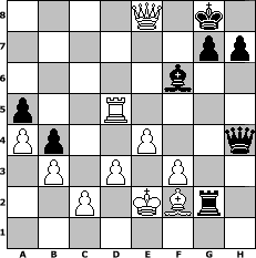 game notation in PGN-format [Event "Hobbyschach"] [Site "www.myChess.de"] [Date "2004.06.26"] [Round "1"] [White "MStr"] [Black "Knight"] [ECO "C25"] [WhitemyELO "1419"] [BlackmyELO "1208"] [Result "1-0"] [TimeControl "10/1728000"] [WhiteDays "84"] [BlackDays "80"] [MyChessNo "5399"] 1. e4 e5 2. Nc3 Nc6 3. Bb5 a6 4. Bxc6 dxc6 5. d3 Bb4 6. Bd2 Nf6 7. Nf3 Bg4 8. h3 Bxf3 9. Qxf3 O-O 10. O-O-O a5 11. a3 Bd6 12. g4 b5 13. g5 Ne8 14. Ne2 b4 15. a4 c5 16. b3 f6 17. gxf6 Rxf6 18. Qg3 Rg6 19. Qe3 Nf6 20. Rdg1 Rxg1+ 21. Rxg1 Nh5 22. Rg5 Nf4 23. h4 Be7 24. Rxe5 Nxe2+ 25. Qxe2 Bxh4 26. Rxc5 Be7 27. Rf5 c5 28. Qg4 Ra6 29. Be3 Rg6 30. Qf3 Rg1+ 31. Kd2 Rg6 32. Bxc5 Bg5+ 33. Ke2 Bf6 34. Rd5 Qb8 35. Qf5 Qe8 36. Bb6 Rg5 37. Qd7 Qh5+ 38. f3 Rg2+ 39. Bf2 Qh4 40. Qe8# 1-0 position notation in FEN-format 4Q1k1/6pp/5b2/p2R4/Pp2P2q/1P1P1P2/2P1KBr1/8 - - - 4 40 Captured white pieces: Captured black pieces: Click on a captured piece in order to display the desired move!