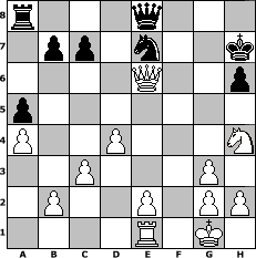 game notation in PGN-format [Event "Smørrebrød-Turnier"] [Site "www.myChess.de"] [Date "2010.03.17"] [Round "1"] [White "Seneca"] [Black "Knight"] [ECO "B01"] [WhitemyELO "1512"] [BlackmyELO "1143"] [Result "1-0"] [TimeControl "10/864000"] [WhiteDays "28"] [BlackDays "30"] [MyChessNo "64017"] 1. e4 d5 2. exd5 Nf6 3. Bb5+ Bd7 4. Bc4 e5 5. dxe6 Bxe6 6. Bxe6 fxe6 7. Nf3 Bc5 8. O-O Nc6 9. c3 O-O 10. d4 Bd6 11. Bg5 a5 12. a4 h6 13. Bh4 g5 14. Bg3 Bxg3 15. fxg3 Nh5 16. Nbd2 g4 17. Nh4 Rxf1+ 18. Nxf1 Nf6 19. Ne3 Ne7 20. Nxg4 Nxg4 21. Qxg4+ Kh7 22. Qxe6 Qe8 23. Re1 1-0 position notation in FEN-format r3q3/1pp1n2k/4Q2p/p7/P2P3N/2P3P1/1P2P1PP/4R1K1 - - - 2 23 Captured white pieces: Captured black pieces: Click on a captured piece in order to display the desired move!