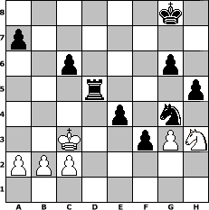 game notation in PGN-format [Event "unter uns Nr. 17"] [Site "www.myChess.de"] [Date "2014.02.13"] [Round "1"] [White "beowulf"] [Black "Schefsche"] [ECO "A20"] [WhitemyELO "1350"] [BlackmyELO "1427"] [Result "0-1"] [TimeControl "10/864000"] [WhiteDays "38"] [BlackDays "28"] [MyChessNo "92924"] 1. c4 e5 2. g3 d5 3. Bg2 d4 4. d3 Bb4+ 5. Bd2 Bxd2+ 6. Nxd2 Nf6 7. e3 dxe3 8. fxe3 Qxd3 9. Qb3 Qxb3 10. Nxb3 O-O 11. O-O-O e4 12. Ne2 Bg4 13. Rd2 Nc6 14. Nc3 Bf3 15. Bxf3 exf3 16. Rf1 Ne5 17. Nc5 Rad8 18. Nxb7 Rxd2 19. Kxd2 Nxc4+ 20. Kc1 Ne5 21. Nc5 Nfg4 22. N5e4 Nxh2 23. Rf2 Nd3+ 24. Kd2 Nxf2 25. Nxf2 h5 26. Ke1 Re8 27. Nd5 c6 28. Nf4 Rxe3+ 29. Kd2 Re5 30. Kd3 g6 31. Ne4 Ng4 32. Nh3 f5 33. Kd4 Rd5+ 34. Kc3 fxe4 0-1 position notation in FEN-format 6k1/p7/2p3p1/3r3p/4p1n1/2K2pPN/PPP5/8 - - - 0 35 Captured white pieces: Captured black pieces: Click on a captured piece in order to display the desired move!