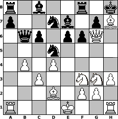 | game notation in PGN-format [Event "Mail"] [Site "www.myChess.de"] [Date "2012.05.01"] [Round "1"] [White "Winston"] [Black "Haki"] [ECO "B01"] [WhitemyELO "1478"] [BlackmyELO "1334"] [Result "1-0"] [TimeControl "10/864000"] [WhiteDays "10"] [BlackDays "10"] [MyChessNo "81406"] 1. e4 d5 2. exd5 Qxd5 3. Nc3 Qa5 4. h3 c6 5. Nf3 Nf6 6. d4 b5 7. Bd2 b4 8. Ne2 Qb6 9. a3 e6 10. axb4 Bxb4 11. c3 Be7 12. b4 O-O 13. Ng3 Nbd7 14. Qc2 Nd5 15. Bd3 f6 16. Bxh7+ Kh8 17. Qg6 1-0 position notation in FEN-format r1b2r1k/p2nb1pB/1qp1ppQ1/3n4/1P1P4/2P2NNP/3B1PP1/R3K2R - KQ - 2 17 Captured white pieces:                              Captured black pieces:                               Click on a captured piece in order to display the desired move!