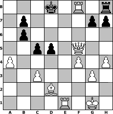 game notation in PGN-format [Event "Summer Games 2021"] [Site "www.myChess.de"] [Date "2021.08.01"] [Round "1"] [White "lotchi"] [Black "beowulf"] [ECO "D02"] [WhitemyELO "1364"] [BlackmyELO "1373"] [Result "1-0"] [TimeControl "10/86400"] [WhiteDays "01"] [BlackDays "01"] [MyChessNo "122687"] 1. d4 d5 2. Nf3 Bg4 3. Ne5 Nf6 4. Nxg4 Nxg4 5. e4 Qd7 6. Be2 Nf6 7. e5 Ng8 8. Nd2 e6 9. Nf3 Bb4+ 10. Bd2 Nc6 11. a3 Ba5 12. b4 Bb6 13. c3 f6 14. O-O fxe5 15. b5 Nce7 16. dxe5 Ng6 17. a4 c5 18. h4 Bc7 19. b6 axb6 20. Bb5 N8e7 21. Bxd7+ Kxd7 22. g3 Nxe5 23. Nxe5+ Bxe5 24. f4 Bf6 25. Qb1 Kc6 26. Re1 Nf5 27. Rxe6+ Kd7 28. Qxf5 Raf8 29. Rxf6+ Ke8 30. Re1+ Kd8 31. Rxf8+ 1-0 position notation in FEN-format 3k1R1r/1p4pp/1p6/2pp1Q2/P4P1P/2P3P1/3B4/4R1K1 - - - 0 31 Captured white pieces: Captured black pieces: Click on a captured piece in order to display the desired move!