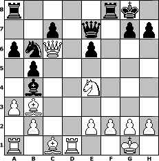 game notation in PGN-format [Event "Die letzten Sommertage!!! Teil2"] [Site "www.myChess.de"] [Date "2009.09.14"] [Round "1"] [White "Helmut48"] [Black "Andylein1989"] [ECO "C70"] [WhitemyELO "1769"] [BlackmyELO "1537"] [Result "1-0"] [TimeControl "10/864000"] [WhiteDays "20"] [BlackDays "14"] [MyChessNo "59021"] 1. e4 e5 2. Nf3 Nc6 3. Bb5 a6 4. Ba4 Bc5 5. c3 b5 6. Bb3 d6 7. d4 exd4 8. cxd4 Bb4+ 9. Nc3 Bg4 10. O-O Bxf3 11. Qxf3 Nf6 12. Rd1 O-O 13. e5 Nd7 14. Qxc6 Nb6 15. Ne4 dxe5 16. dxe5 Qe7 17. e6 fxe6 18. a3 1-0 position notation in FEN-format r4rk1/2p1q1pp/pnQ1p3/1p6/1b2N3/PB6/1P2PPPP/R1BR2K1 - - - 0 18 Captured white pieces: Captured black pieces: Click on a captured piece in order to display the desired move!