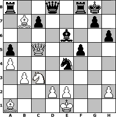 game notation in PGN-format [Event "Amateur´s Mind"] [Site "www.myChess.de"] [Date "2025.03.20"] [Round "1"] [White "Hobbykegler"] [Black "Ziegert"] [ECO "A20"] [WhitemyELO "1091"] [BlackmyELO "2006"] [Result "0-1"] [TimeControl "10/2592000"] [WhiteDays "28"] [BlackDays "25"] [MyChessNo "133067"] 1. c4 e5 2. b3 Nc6 3. Bb2 Be7 4. Qc2 Nf6 5. Nf3 Nb4 6. Qc3 d5 7. cxd5 Nfxd5 8. Qxe5 Nc2+ 9. Kd1 Nxa1 10. Bxa1 Nf6 11. g3 O-O 12. Ng5 a5 13. a4 h6 14. Ne4 Be6 15. Nbc3 Ng4 16. Qb5 f5 17. Nc5 Nxf2+ 18. Ke1 Bxc5 19. Qxc5 Nxh1 20. Bg2 Nxg3 21. Bxb7 Ne4 0-1 position notation in FEN-format r2q1rk1/1Bp3p1/4b2p/p1Q2p2/P3n3/1PN5/3PP2P/B3K3 - - - 1 22 Captured white pieces: Captured black pieces: Click on a captured piece in order to display the desired move!