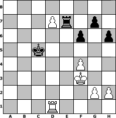game notation in PGN-format [Event "Kellertunier"] [Site "www.myChess.de"] [Date "2005.08.15"] [Round "1"] [White "Andylein1989"] [Black "Pocket"] [ECO "C60"] [WhitemyELO "1414"] [BlackmyELO "1282"] [Result "1-0"] [TimeControl "10/864000"] [WhiteDays "10"] [BlackDays "10"] [MyChessNo "16253"] 1. e4 e5 2. Nf3 Nc6 3. Bb5 Bd6 4. Bxc6 bxc6 5. d4 Ba6 6. dxe5 Bc5 7. Nc3 Ne7 8. a3 O-O 9. b4 Bb6 10. Na4 Qb8 11. Nxb6 Qxb6 12. Be3 c5 13. Bxc5 Qe6 14. Bxe7 Qxe7 15. Qd2 Rad8 16. O-O-O c5 17. Rhe1 cxb4 18. Qxb4 Qxb4 19. axb4 Bb5 20. Rd5 Rb8 21. Nd4 Bc6 22. Nxc6 dxc6 23. Ra5 Rxb4 24. Rxa7 Rfb8 25. Rc7 h6 26. Rxc6 Rb1+ 27. Kd2 Rd8+ 28. Rd6 Rbb8 29. Rd1 f6 30. Ke2 Rxd6 31. exd6 Rd8 32. c4 Kf7 33. c5 Ke6 34. f4 Kd7 35. e5 Kc6 36. e6 Kxc5 37. e7 Re8 38. d7 Rxe7+ 39. Kf3 1-0 position notation in FEN-format 8/3Pr1p1/5p1p/2k5/5P2/5K2/6PP/3R4 - - - 1 39 Captured white pieces: ![]() ![]() ![]() ![]() ![]() ![]() ![]() ![]() ![]() ![]() ![]() ![]() ![]() ![]() ![]() Captured black pieces: ![]() ![]() ![]() ![]() ![]() ![]() ![]() ![]() ![]() ![]() ![]() ![]() ![]() ![]() ![]() Click on a captured piece in order to display the desired move!