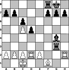 game notation in PGN-format [Event "Bald kommt der Winter"] [Site "www.myChess.de"] [Date "2013.10.31"] [Round "1"] [White "Knight"] [Black "Schefsche"] [ECO "A21"] [WhitemyELO "1222"] [BlackmyELO "1455"] [Result "0-1"] [TimeControl "10/2592000"] [WhiteDays "90"] [BlackDays "81"] [MyChessNo "90851"] 1. c4 e5 2. Nc3 Bc5 3. Nf3 Nf6 4. Nxe5 O-O 5. d4 Bb4 6. Bd2 Bxc3 7. Bxc3 Ne4 8. Qd3 d5 9. c5 Qf6 10. Nf3 Bg4 11. Qe3 Nc6 12. O-O-O Rae8 13. Ne5 Qxf2 14. Bd2 Qxe3 15. Bxe3 Nxe5 16. dxe5 Rxe5 17. g3 Nxg3 18. hxg3 Rxe3 19. Rd2 c6 20. Rh2 Rxg3 0-1 position notation in FEN-format 5rk1/pp3ppp/2p5/2Pp4/6b1/6r1/PPPRP2R/2K2B2 - - - 0 21 Captured white pieces: Captured black pieces: Click on a captured piece in order to display the desired move!