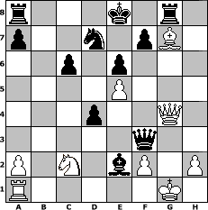 game notation in PGN-format [Event "Sp"] [Site "www.myChess.de"] [Date "2011.09.07"] [Round "1"] [White "Knight"] [Black "morchel"] [ECO "A45"] [WhitemyELO "1197"] [BlackmyELO "1446"] [Result "0-1"] [TimeControl "10/1728000"] [WhiteDays "20"] [BlackDays "19"] [MyChessNo "76180"] 1. d4 Nf6 2. g4 Nxg4 3. e4 d5 4. Be2 Nf6 5. e5 Nfd7 6. Nc3 e6 7. Nf3 c5 8. Bg5 Qb6 9. dxc5 Bxc5 10. O-O Qxb2 11. Qd2 Bb4 12. Na4 Qa3 13. c3 Ba5 14. Qf4 Nc6 15. Bb5 h6 16. Bxc6 bxc6 17. Bxh6 Bxc3 18. Bxg7 Rg8 19. Qg4 Ba6 20. Nxc3 Bxf1 21. Nd1 Be2 22. Ne3 d4 23. Nc2 Qxf3 0-1 position notation in FEN-format r3k1r1/p2n1pB1/2p1p3/4P3/3p2Q1/5q2/P1N1bP1P/R5K1 - q - 0 24 Captured white pieces: Captured black pieces: Click on a captured piece in order to display the desired move!