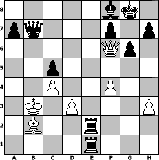 game notation in PGN-format [Event "Trainingslager II"] [Site "www.myChess.de"] [Date "2011.05.24"] [Round "2"] [White "augustus"] [Black "Duschgel"] [ECO "B10"] [WhitemyELO "1236"] [BlackmyELO "1571"] [Result "0-1"] [TimeControl "10/1728000"] [WhiteDays "10"] [BlackDays "20"] [MyChessNo "74162"] 1. e4 c6 2. d3 d5 3. e5 c5 4. Nf3 Bg4 5. Be2 e6 6. h3 Bxf3 7. Bxf3 Ne7 8. Bg5 Nbc6 9. Qe2 Qc7 10. Nc3 Nxe5 11. Nb5 Nxf3+ 12. gxf3 Qa5+ 13. Nc3 d4 14. Bd2 dxc3 15. Bxc3 Qc7 16. O-O-O Nd5 17. Be5 Qa5 18. a3 Rc8 19. c4 Nf6 20. Rhg1 b5 21. f4 b4 22. f5 Rc6 23. Rd2 bxa3 24. bxa3 Qxa3+ 25. Bb2 Qb3 26. Qf3 Qb7 27. Re2 Qc8 28. Rge1 Be7 29. Qg2 g6 30. fxe6 Rxe6 31. Qg5 O-O 32. Qh6 Re8 33. f4 Bf8 34. Qh4 Rxe2 35. Qxf6 Rxe1+ 36. Kc2 R8e2+ 37. Kb3 Qb7+ 0-1 position notation in FEN-format 5bk1/pq3p1p/5Qp1/2p5/2P2P2/1K1P3P/1B2r3/4r3 - - - 4 38 Captured white pieces: Captured black pieces: Click on a captured piece in order to display the desired move!