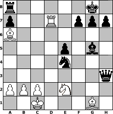 game notation in PGN-format [Event "FREUNDESTUNIER"] [Site "www.myChess.de"] [Date "2005.10.28"] [Round "2"] [White "Knight"] [Black "crca108"] [ECO "D00"] [WhitemyELO "1280"] [BlackmyELO "1486"] [Result "0-1"] [TimeControl "10/864000"] [WhiteDays "27"] [BlackDays "30"] [MyChessNo "19002"] 1. d4 d5 2. e4 dxe4 3. Nc3 Nf6 4. f3 exf3 5. Qxf3 Qxd4 6. Be3 Qb4 7. O-O-O e5 8. h3 Be7 9. Nb5 Na6 10. Bd2 Qc5 11. Be3 Qb4 12. g4 Bd7 13. Qxb7 O-O 14. Nxc7 Qxb7 15. Nxa8 Qxh1 16. Bxa6 Rxa8 17. Ne2 Qf3 18. Bg1 Qxh3 19. g5 Ne4 20. Rxd7 Bxg5+ 0-1 position notation in FEN-format r5k1/p2R1ppp/B7/4p1b1/4n3/7q/PPP1N3/2K3B1 - - - 0 21 Captured white pieces: Captured black pieces: Click on a captured piece in order to display the desired move!