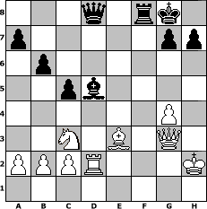 game notation in PGN-format [Event "Auf zum Gegenangriff mit Traxler !"] [Site "www.myChess.de"] [Date "2019.07.03"] [Round "1"] [White "sprinterde"] [Black "alibengali"] [ECO "C57"] [WhitemyELO "1761"] [BlackmyELO "1702"] [Result "1-0"] [TimeControl "10/1728000"] [WhiteDays "78"] [BlackDays "76"] [MyChessNo "115283"] 1. e4 e5 2. Nf3 Nc6 3. Bc4 Nf6 4. Ng5 Bc5 5. Nxf7 Bxf2+ 6. Kxf2 Nxe4+ 7. Ke3 Qh4 8. g3 Nxg3 9. hxg3 Qd4+ 10. Kf3 O-O 11. Rh4 e4+ 12. Rxe4 Ne5+ 13. Rxe5 Qxe5 14. Nc3 Qf5+ 15. Kg2 d5 16. g4 Qxf7 17. Bxd5 Be6 18. Bf3 c6 19. d4 Rad8 20. Be3 c5 21. d5 Qe7 22. Bf2 b6 23. Qe2 Rxf3 24. Qxf3 Bc8 25. Re1 Qg5 26. Re4 Rf8 27. Qe3 Qg6 28. Qg3 Bb7 29. Re7 Bc8 30. Re4 Bb7 31. Qe5 Bc8 32. Qg3 Bb7 33. Re2 Qg5 34. Be3 Bxd5+ 35. Kh2 Qd8 36. Rd2 1-0 position notation in FEN-format 3q1rk1/p5pp/1p6/2pb4/6P1/2N1B1Q1/PPPR3K/8 - - - 3 36 Captured white pieces: Captured black pieces: Click on a captured piece in order to display the desired move!