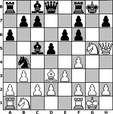 game notation in PGN-format [Event "Kellertunier"] [Site "www.myChess.de"] [Date "2005.08.15"] [Round "1"] [White "Pocket"] [Black "tuergeist"] [ECO "A03"] [WhitemyELO "1282"] [BlackmyELO "1264"] [Result "1-0"] [TimeControl "10/864000"] [WhiteDays "10"] [BlackDays "10"] [MyChessNo "16244"] 1. f4 d5 2. Nf3 Nf6 3. e3 Nc6 4. b3 e6 5. Bb2 Bc5 6. Bd3 a6 7. O-O O-O 8. Ng5 Nb4 9. Bxf6 gxf6 10. Qh5 1-0 position notation in FEN-format r1bq1rk1/1pp2p1p/p3pp2/2bp2NQ/1n3P2/1P1BP3/P1PP1PPP/RN3RK1 - - - 1 10 Captured white pieces: ![]() ![]() ![]() ![]() ![]() ![]() ![]() ![]() ![]() ![]() ![]() ![]() ![]() ![]() ![]() Captured black pieces: ![]() ![]() ![]() ![]() ![]() ![]() ![]() ![]() ![]() ![]() ![]() ![]() ![]() ![]() ![]() Click on a captured piece in order to display the desired move!