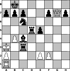 game notation in PGN-format [Event "F"] [Site "www.myChess.de"] [Date "2017.08.16"] [Round "1"] [White "augustus"] [Black "Erich"] [ECO "C20"] [WhitemyELO "1214"] [BlackmyELO "2162"] [Result "0-1"] [TimeControl "10/2592000"] [WhiteDays "87"] [BlackDays "90"] [MyChessNo "109188"] 1. e4 e5 2. d3 Nc6 3. Nf3 Nf6 4. Bg5 Be7 5. c3 d5 6. h3 dxe4 7. Bxf6 exf3 8. Bxe7 fxg2 9. Bxd8 gxh1=Q 10. Bh4 Bxh3 11. Kd2 Bxf1 12. Bg3 O-O-O 13. Qg4+ Kb8 14. Na3 Rxd3+ 15. Kc2 Rhd8 16. Nc4 Rxg3 17. Qxg3 Qe4+ 18. Kb3 Bxc4+ 19. Ka3 Rd5 20. b4 Qc2 21. Qxg7 Qxc3+ 0-1 position notation in FEN-format 1k6/ppp2pQp/2n5/3rp3/1Pb5/K1r5/P3PP2/R7 - - - 0 22 Captured white pieces: Captured black pieces: Click on a captured piece in order to display the desired move!
