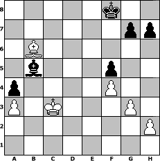 game notation in PGN-format [Event "Mitten ins Gr"] [Site "www.myChess.de"] [Date "2015.05.11"] [Round "1"] [White "beowulf"] [Black "wiesel"] [ECO "A34"] [WhitemyELO "1347"] [BlackmyELO "1247"] [Result "1/2-1/2"] [TimeControl "10/1728000"] [WhiteDays "53"] [BlackDays "76"] [MyChessNo "99173"] 1. c4 c5 2. Nc3 Nf6 3. e3 e6 4. d4 cxd4 5. exd4 Bb4 6. Qa4 Bxc3+ 7. bxc3 O-O 8. Bg5 Nc6 9. d5 exd5 10. cxd5 Qe8+ 11. Be2 Nxd5 12. c4 Nc3 13. Qc2 Nxe2 14. Nxe2 Nd4 15. Qd3 Nxe2 16. Qxe2 Qxe2+ 17. Kxe2 Re8+ 18. Kd2 d6 19. Rhe1 Bd7 20. Rxe8+ Rxe8 21. Re1 f6 22. Bf4 Re6 23. Rxe6 Bxe6 24. Bxd6 Bxc4 25. a3 Bb5 26. f4 f5 27. g3 a5 28. Kc3 b6 29. Bc7 Kf8 30. Bxb6 a4 1/2-1/2 position notation in FEN-format 5k2/6pp/1B6/1b3p2/p4P2/P1K3P1/7P/8 - - - 0 31 Captured white pieces: Captured black pieces: Click on a captured piece in order to display the desired move!