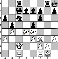game notation in PGN-format [Event "M"] [Site "www.myChess.de"] [Date "2013.09.19"] [Round "1"] [White "FrankB"] [Black "reisinger"] [ECO "D02"] [WhitemyELO "1650"] [BlackmyELO "1499"] [Result "0-1"] [TimeControl "10/3456000"] [WhiteDays "00"] [BlackDays "40"] [MyChessNo "90325"] 1. d4 d5 2. Nf3 e6 3. a3 c5 4. e3 Nc6 5. dxc5 Bxc5 6. b4 Bd6 7. Bb2 Nf6 8. c4 dxc4 9. Bxc4 O-O 10. O-O Qc7 11. Bxf6 gxf6 12. Nbd2 Kh8 13. Rc1 a6 14. h3 b5 15. Be2 Rg8 16. Ne4 Be7 17. Qc2 Bd7 18. Nd4 Rac8 19. Bf3 e5 0-1 position notation in FEN-format 2r3rk/2qbbp1p/p1n2p2/1p2p3/1P1NN3/P3PB1P/2Q2PP1/2R2RK1 - - - 0 20 Captured white pieces: Captured black pieces: Click on a captured piece in order to display the desired move!