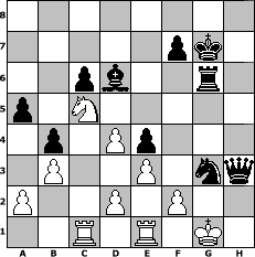 game notation in PGN-format [Event "Abtausch Variante"] [Site "www.myChess.de"] [Date "2007.02.05"] [Round "1"] [White "Andylein1989"] [Black "Meta"] [ECO "D35"] [WhitemyELO "1459"] [BlackmyELO "2155"] [Result "0-1"] [TimeControl "10/1728000"] [WhiteDays "80"] [BlackDays "78"] [MyChessNo "32294"] 1. d4 d5 2. c4 e6 3. Nc3 Nf6 4. cxd5 exd5 5. Bg5 Be7 6. Qa4+ c6 7. Nf3 Bf5 8. Qb3 b5 9. e3 O-O 10. Be2 Nbd7 11. O-O a5 12. Qd1 Bd6 13. Re1 b4 14. Na4 Qc7 15. h3 Ne4 16. Bh4 h6 17. Bd3 g5 18. Bxe4 dxe4 19. Nxg5 hxg5 20. Bxg5 Kg7 21. Qh5 Rh8 22. Bh6+ Rxh6 23. Qxf5 Nf6 24. Qg5+ Rg6 25. Qf5 Rh8 26. b3 Rh5 27. Qxh5 Nxh5 28. Rac1 Qd7 29. Nc5 Qxh3 30. g3 Nxg3 0-1 position notation in FEN-format 8/5pk1/2pb2r1/p1N5/1p1Pp3/1P2P1nq/P2P1P2/2R1R1K1 - - - 0 31 Captured white pieces: Captured black pieces: Click on a captured piece in order to display the desired move!