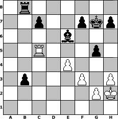 game notation in PGN-format [Event "el ajedrez"] [Site "www.myChess.de"] [Date "2006.02.04"] [Round "1"] [White "Andylein1989"] [Black "Nightflight"] [ECO "C84"] [WhitemyELO "1385"] [BlackmyELO "1469"] [Result "0-1"] [TimeControl "10/2592000"] [WhiteDays "30"] [BlackDays "27"] [MyChessNo "22237"] 1. e4 e5 2. Nf3 Nc6 3. Bb5 a6 4. Ba4 Nf6 5. O-O Be7 6. d4 exd4 7. Nxd4 O-O 8. Nxc6 dxc6 9. Nc3 Bb4 10. f3 Be6 11. Bd2 Qd4+ 12. Rf2 Bxc3 13. Bxc3 Qxa4 14. Bxf6 gxf6 15. b3 Qa3 16. Qd4 Qe7 17. h3 Rfd8 18. Qe3 Qd6 19. Re1 Qd4 20. Qf4 Qe5 21. Qh4 Qg5 22. Qxg5+ fxg5 23. a4 Kg7 24. Kh2 Rd4 25. Ree2 b5 26. axb5 cxb5 27. c3 Rd3 28. c4 Rxb3 29. cxb5 axb5 30. Rb2 Rxb2 31. Rxb2 Rb8 32. Rc2 b4 33. Rc5 b3 0-1 position notation in FEN-format 1r6/2p2pkp/4b3/2R3p1/4P3/1p3P1P/6PK/8 - - - 0 34 Captured white pieces: ![]() ![]() ![]() ![]() ![]() ![]() ![]() ![]() ![]() ![]() ![]() ![]() ![]() ![]() ![]() Captured black pieces: ![]() ![]() ![]() ![]() ![]() ![]() ![]() ![]() ![]() ![]() ![]() ![]() ![]() ![]() ![]() Click on a captured piece in order to display the desired move!