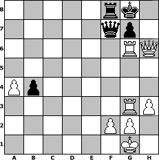 game notation in PGN-format [Event "Sommerpausen-F"] [Site "www.myChess.de"] [Date "2013.07.07"] [Round "1"] [White "Winston"] [Black "Gauss1233"] [ECO "B01"] [WhitemyELO "1487"] [BlackmyELO "1396"] [Result "1-0"] [TimeControl "10/2592000"] [WhiteDays "150"] [BlackDays "123"] [MyChessNo "89170"] 1. e4 d5 2. e5 c5 3. h3 Nc6 4. Nf3 e6 5. a3 Nge7 6. c3 Ng6 7. d4 cxd4 8. cxd4 Be7 9. Be2 O-O 10. O-O a6 11. Bd3 b5 12. Qc2 Bb7 13. Be3 b4 14. a4 Qb6 15. b3 Rac8 16. Qe2 Na5 17. Nbd2 Rc3 18. Rab1 Rfc8 19. Bg5 Bxg5 20. Nxg5 Qxd4 21. Bxa6 Rc2 22. Rbd1 Bxa6 23. Qxa6 Qc5 24. Qe2 Nxb3 25. Qh5 h6 26. Nxf7 Kxf7 27. Qf3+ Kg8 28. Qxb3 Rc3 29. Qb1 Nxe5 30. Nb3 Qe7 31. Nd4 R3c4 32. Rfe1 Kf7 33. Rxe5 Qc7 34. Ree1 Re8 35. Nb5 Qc5 36. Re3 d4 37. Rg3 Kg8 38. Qg6 Qe7 39. Nxd4 Rc7 40. Re1 Qf7 41. Qxh6 Rce7 42. Nc6 Rf8 43. Nxe7+ Qxe7 44. Rxe6 Qf7 45. Reg6 1-0 position notation in FEN-format 5rk1/5qp1/6RQ/8/Pp6/6RP/5PP1/6K1 - - - 2 45 Captured white pieces: Captured black pieces: Click on a captured piece in order to display the desired move!