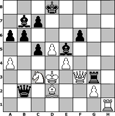 game notation in PGN-format [Event "Anderssen-Club-Meisterschaft"] [Site "www.myChess.de"] [Date "2006.04.11"] [Round "1"] [White "skifahrer"] [Black "rikilatic"] [ECO "A02"] [WhitemyELO "1538"] [BlackmyELO "1568"] [Result "0-1"] [TimeControl "10/864000"] [WhiteDays "10"] [BlackDays "10"] [MyChessNo "24429"] 1. f4 b6 2. Nf3 Bb7 3. e3 e6 4. d4 Nf6 5. Bd3 Nc6 6. O-O Ng4 7. Ng5 h5 8. Bh7 Qe7 9. Be4 O-O-O 10. Bf3 f6 11. Nh3 g5 12. Nc3 Qd6 13. Nb5 Qb4 14. a4 a6 15. Bd2 Qe7 16. Bxc6 dxc6 17. Nc3 Qg7 18. fxg5 Be7 19. Nf4 Qg8 20. h3 Qxg5 21. Nxe6 Qg6 22. Nxd8 Kxd8 23. Rf4 Bd6 24. Rf3 Bh2+ 25. Kf1 c5 26. d5 Be5 27. hxg4 hxg4 28. Kf2 gxf3 29. Qxf3 Qxc2 30. Rd1 Qxb2 31. e4 Bd4+ 32. Ke2 Rg8 33. Kd3 Be5 34. Rh1 Rg3 0-1 position notation in FEN-format 3k4/1bp5/pp3p2/2pPb3/P3P3/2NK1Qr1/1q1B2P1/7R - - - 7 35 Captured white pieces: ![]() ![]() ![]() ![]() ![]() ![]() ![]() ![]() ![]() ![]() ![]() ![]() ![]() ![]() ![]() Captured black pieces: ![]() ![]() ![]() ![]() ![]() ![]() ![]() ![]() ![]() ![]() ![]() ![]() ![]() ![]() ![]() Click on a captured piece in order to display the desired move!