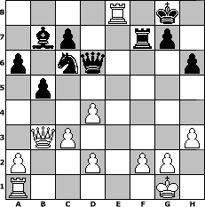 game notation in PGN-format [Event "Carpe Diem"] [Site "www.myChess.de"] [Date "2007.07.31"] [Round "1"] [White "ujack1961"] [Black "reisinger"] [ECO "A50"] [WhitemyELO "1761"] [BlackmyELO "1637"] [Result "1-0"] [TimeControl "10/864000"] [WhiteDays "30"] [BlackDays "30"] [MyChessNo "36837"] 1. d4 Nf6 2. c4 d5 3. Nc3 e6 4. Bg5 Bb4 5. e3 h6 6. Bxf6 Qxf6 7. Nf3 Nc6 8. cxd5 Bxc3+ 9. bxc3 exd5 10. Qb3 Qd6 11. Bd3 O-O 12. O-O a6 13. h3 Re8 14. Rfe1 b5 15. e4 dxe4 16. Bxe4 Bb7 17. Ne5 Re7 18. Bd5 Rf8 19. Bxf7+ Rexf7 20. Nxf7 Rxf7 21. Re8+ 1-0 position notation in FEN-format 4R1k1/1bp2rp1/p1nq3p/1p6/3P4/1QP4P/P2P1PP1/R5K1 - - - 1 21 Captured white pieces: Captured black pieces: Click on a captured piece in order to display the desired move!