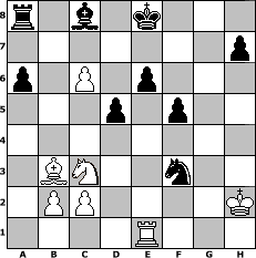 game notation in PGN-format [Event "Novemberturnier"] [Site "www.myChess.de"] [Date "2004.11.04"] [Round "1"] [White "Hobbykegler"] [Black "Master1"] [ECO "B01"] [WhitemyELO "1142"] [BlackmyELO "1217"] [Result "0-1"] [TimeControl "10/2592000"] [WhiteDays "112"] [BlackDays "120"] [MyChessNo "7771"] 1. e4 d5 2. e5 e6 3. d4 f6 4. Nf3 fxe5 5. Nxe5 Qe7 6. Bd3 Nd7 7. Bb5 c6 8. Ba4 Nxe5 9. dxe5 b5 10. Bb3 g6 11. Qg4 Bh6 12. O-O Bxc1 13. Rxc1 Nh6 14. Qf3 Rf8 15. Qe2 Qg5 16. Nc3 a6 17. Rd1 Rf5 18. Rf1 Qh5 19. Rae1 Qxe2 20. Rxe2 Nf7 21. g4 Rxe5 22. Rxe5 Nxe5 23. Re1 Nxg4 24. h3 Nf6 25. f4 Nh5 26. f5 gxf5 27. a4 Nf4 28. axb5 Nxh3+ 29. Kh2 Ng5 30. bxc6 Nf3+ 0-1 position notation in FEN-format r1b1k3/7p/p1P1p3/3p1p2/8/1BN2n2/1PP4K/4R3 - q - 1 31 Captured white pieces: Captured black pieces: Click on a captured piece in order to display the desired move!