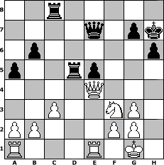 game notation in PGN-format [Event "M"] [Site "www.myChess.de"] [Date "2013.09.19"] [Round "1"] [White "Tomino"] [Black "reisinger"] [ECO "D02"] [WhitemyELO "1706"] [BlackmyELO "1499"] [Result "1-0"] [TimeControl "10/3456000"] [WhiteDays "40"] [BlackDays "40"] [MyChessNo "90311"] 1. d4 d5 2. Nf3 e6 3. Bf4 Bd6 4. Bg3 Bxg3 5. hxg3 Nf6 6. e3 b6 7. Bd3 h6 8. Nbd2 c5 9. c3 c4 10. Bc2 Bd7 11. e4 dxe4 12. Nxe4 Bc6 13. Qe2 Bd5 14. Ba4+ Nc6 15. Nxf6+ Qxf6 16. Ne5 Rc8 17. Bxc6+ Bxc6 18. Qxc4 O-O 19. Nxc6 Rfd8 20. Qb5 Rd5 21. Qa4 a5 22. O-O Kh7 23. Ne5 Qe7 24. Rfe1 f6 25. Nf3 e5 26. dxe5 fxe5 27. Qe4+ 1-0 position notation in FEN-format 2r5/4q1pk/1p5p/p2rp3/4Q3/2P2NP1/PP3PP1/R3R1K1 - - - 1 27 Captured white pieces: Captured black pieces: Click on a captured piece in order to display the desired move!