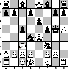 game notation in PGN-format [Event "Hertener Schachfreunde-Jahresstart"] [Site "www.myChess.de"] [Date "2012.02.01"] [Round "1"] [White "micha62"] [Black "Helmut48"] [ECO "B40"] [WhitemyELO "1054"] [BlackmyELO "1868"] [Result "0-1"] [TimeControl "10/2592000"] [WhiteDays "13"] [BlackDays "59"] [MyChessNo "79559"] 1. e4 c5 2. Nf3 e6 3. e5 Ne7 4. h3 Ng6 5. h4 Nc6 6. Nc3 Ngxe5 7. h5 Nxf3+ 8. Ke2 Ncd4+ 9. Ke3 Qg5+ 10. Ke4 f5+ 0-1 position notation in FEN-format r1b1kb1r/pp1p2pp/4p3/2p2pqP/3nK3/2N2n2/PPPP1PP1/R1BQ1B1R - kq - 0 11 Captured white pieces: Captured black pieces: Click on a captured piece in order to display the desired move!