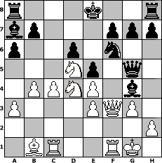 | game notation in PGN-format [Event "Wrixum Open die II."] [Site "www.myChess.de"] [Date "2005.06.22"] [Round "1"] [White "Papale"] [Black "chessmike"] [ECO "B41"] [WhitemyELO "1766"] [BlackmyELO "1919"] [Result "0-1"] [TimeControl "10/1728000"] [WhiteDays "14"] [BlackDays "39"] [MyChessNo "14400"] 1. e4 c5 2. Nf3 e6 3. d4 cxd4 4. Nxd4 a6 5. c4 Nf6 6. Nc3 Qc7 7. Be3 Nc6 8. Rc1 Bb4 9. Bd3 Ne5 10. O-O Neg4 11. g3 Nxe3 12. fxe3 Bc5 13. a3 Qe5 14. Bb1 Qg5 15. Qe2 d6 16. b4 Ba7 17. Qf3 e5 18. Nd5 Bg4 0-1 position notation in FEN-format r3k2r/bp3ppp/p2p1n2/3Np1q1/1PPNP1b1/P3PQP1/7P/1BR2RK1 - kq - 2 19 Captured white pieces:                              Captured black pieces:                               Click on a captured piece in order to display the desired move!