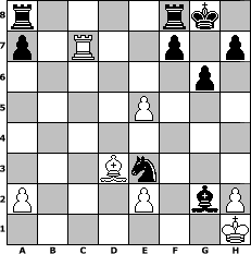 game notation in PGN-format [Event "Evans- Angenommen!"] [Site "www.myChess.de"] [Date "2005.04.04"] [Round "1"] [White "MaxPayne"] [Black "Seneca"] [ECO "C52"] [WhitemyELO "1467"] [BlackmyELO "1530"] [Result "0-1"] [TimeControl "10/1728000"] [WhiteDays "42"] [BlackDays "58"] [MyChessNo "11772"] 1. e4 e5 2. Nf3 Nc6 3. Bc4 Bc5 4. b4 Bxb4 5. c3 Ba5 6. d4 exd4 7. Qb3 Qf6 8. Ng5 Nh6 9. Bd2 O-O 10. O-O dxc3 11. Nxc3 Bxc3 12. Bxc3 Qxg5 13. f4 Qc5+ 14. Kh1 Na5 15. Bxa5 Qxa5 16. e5 Qb6 17. Qg3 Nf5 18. Qf3 d6 19. Rae1 Be6 20. Bd3 g6 21. Rb1 Qe3 22. Rxb7 Qxf3 23. Rxf3 Bd5 24. Rf2 Bxb7 25. Rc2 dxe5 26. fxe5 Ne3 27. Rxc7 Bxg2+ 0-1 position notation in FEN-format r4rk1/p1R2p1p/6p1/4P3/8/3Bn3/P3P1bP/7K - - - 0 28 Captured white pieces: Captured black pieces: Click on a captured piece in order to display the desired move!