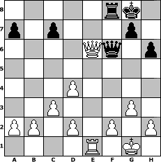 game notation in PGN-format [Event "Emil-Josef Diemer"] [Site "www.myChess.de"] [Date "2017.09.06"] [Round "1"] [White "lisama"] [Black "Knight"] [ECO "D00"] [WhitemyELO "1502"] [BlackmyELO "1197"] [Result "1-0"] [TimeControl "10/2592000"] [WhiteDays "86"] [BlackDays "90"] [MyChessNo "109491"] 1. d4 d5 2. e4 dxe4 3. Nc3 Nf6 4. Bg5 e6 5. Nxe4 Be7 6. Bxf6 Nc6 7. Nf3 Bxf6 8. Bb5 Bd7 9. Nxf6+ Qxf6 10. O-O O-O 11. Bxc6 Bxc6 12. Re1 Rfe8 13. Ne5 Red8 14. c3 Qg5 15. Nxc6 bxc6 16. Re5 Qf6 17. Qa4 Rd6 18. Rc5 h6 19. Re1 Qd8 20. Rxc6 Rd7 21. g3 Qf6 22. Rcxe6 fxe6 23. Qxd7 Rf8 24. Qxe6+ 1-0 position notation in FEN-format 5rk1/p1p3p1/4Qq1p/8/3P4/2P3P1/PP1P1P1P/4R1K1 - - - 0 24 Captured white pieces: Captured black pieces: Click on a captured piece in order to display the desired move!