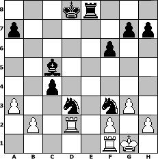 game notation in PGN-format [Event "Camelot Tournament"] [Site "www.myChess.de"] [Date "2006.11.19"] [Round "1"] [White "Anonymus"] [Black "Nightflight"] [ECO "A29"] [WhitemyELO "1595"] [BlackmyELO "1560"] [Result "0-1"] [TimeControl "10/3456000"] [WhiteDays "104"] [BlackDays "087"] [MyChessNo "30239"] 1. c4 e5 2. Nc3 Nc6 3. Nf3 Nf6 4. g3 d5 5. cxd5 Nxd5 6. Bg2 Nb6 7. e4 Bg4 8. Qc2 Nb4 9. Qb3 Be6 10. Nd5 c6 11. Nxe5 cxd5 12. exd5 Bxd5 13. Bxd5 Qxd5 14. Qxd5 N6xd5 15. O-O Nc2 16. Rb1 Rd8 17. d3 Ndb4 18. a3 f6 19. Nc4 Nxd3 20. Bd2 Bc5 21. Kg2 b5 22. Ba5 bxc4 23. Bxd8 Kxd8 24. Rbd1 Re8 25. Rd2 Nce1+ 26. Kg1 Nf3+ 0-1 position notation in FEN-format 3kr3/p5pp/5p2/2b5/2p5/P2n1nP1/1P1R1P1P/5RK1 - - - 6 27 Captured white pieces: Captured black pieces: Click on a captured piece in order to display the desired move!