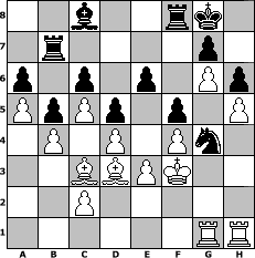 game notation in PGN-format [Event "Thema-2016-01"] [Site "www.myChess.de"] [Date "2016.02.11"] [Round "1"] [White "Achimkogge"] [Black "faustballer"] [ECO "A12"] [WhitemyELO "1424"] [BlackmyELO "1490"] [Result "1/2-1/2"] [TimeControl "10/2592000"] [WhiteDays "29"] [BlackDays "30"] [MyChessNo "102478"] 1. c4 c6 2. Nf3 d5 3. b3 Nf6 4. Bb2 e6 5. e3 Nbd7 6. d4 Ne4 7. h4 Bb4+ 8. Nfd2 Qa5 9. Bd3 Nxd2 10. Nxd2 Nf6 11. f3 Nh5 12. a3 Bxd2+ 13. Qxd2 Qxd2+ 14. Kxd2 O-O 15. g4 Nf6 16. h5 a6 17. c5 Rb8 18. g5 Ne8 19. Bc3 f6 20. g6 h6 21. b4 f5 22. f4 Nf6 23. Ke2 b6 24. a4 b5 25. a5 Ng4 26. Rag1 Rb7 27. Kf3 1/2-1/2 position notation in FEN-format 2b2rk1/1r4p1/p1p1p1Pp/PpPp1p1P/1P1P1Pn1/2BBPK2/2P5/6RR - - - 4 27 Captured white pieces: Captured black pieces: Click on a captured piece in order to display the desired move!