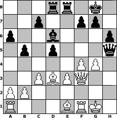 game notation in PGN-format [Event "Es wackelt selbst der Turm.Bei Regen u. bei Sturm"] [Site "www.myChess.de"] [Date "2017.11.20"] [Round "1"] [White "Seneca"] [Black "freizeitspieler"] [ECO "A45"] [WhitemyELO "1479"] [BlackmyELO "1618"] [Result "1-0"] [TimeControl "10/1728000"] [WhiteDays "20"] [BlackDays "19"] [MyChessNo "110412"] 1. d4 Nf6 2. e3 d5 3. Bd3 Nc6 4. c3 e5 5. dxe5 Nxe5 6. Be2 Bf5 7. Nf3 Bd6 8. Nd4 Qd7 9. Nxf5 Qxf5 10. Nd2 O-O 11. Nf3 h6 12. Nxe5 Bxe5 13. O-O Rad8 14. f3 a6 15. Bd3 Qh5 16. h3 Qh4 17. f4 Bd6 18. Qf3 b5 19. Bd2 Rfe8 20. Be1 Qh5 21. g4 Nxg4 22. hxg4 1-0 position notation in FEN-format 3rr1k1/2p2pp1/p2b3p/1p1p3q/5PP1/2PBPQ2/PP6/R3BRK1 - - - 0 22 Captured white pieces: Captured black pieces: Click on a captured piece in order to display the desired move!