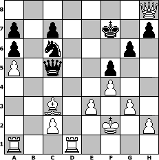 game notation in PGN-format [Event "Auf Die WM!!!!!!!!!!!! (2010 werden wir Meister)"] [Site "www.myChess.de"] [Date "2006.07.21"] [Round "1"] [White "tschulz"] [Black "crca108"] [ECO "A00"] [WhitemyELO "1577"] [BlackmyELO "1409"] [Result "1-0"] [TimeControl "10/2592000"] [WhiteDays "84"] [BlackDays "84"] [MyChessNo "27067"] 1. b4 e5 2. Bb2 e4 3. e3 Nf6 4. b5 d5 5. a4 Bd6 6. d3 O-O 7. a5 Bd7 8. dxe4 dxe4 9. Ne2 Bxb5 10. Nbc3 Ba6 11. g3 Ng4 12. Nxe4 Qe7 13. Bg2 Nc6 14. N2c3 Bb4 15. Qxg4 f5 16. Qg5 Qe5 17. f4 Qb5 18. Bf1 Qd5 19. Kf2 Bxc3 20. Bxc3 g6 21. Nf6+ Rxf6 22. Qxf6 Qd7 23. Qh8+ Kf7 24. Qxa8 Qd5 25. Bxa6 Qc5 26. Qh8 bxa6 27. Rhd1 1-0 position notation in FEN-format 7Q/p1p2k1p/p1n3p1/P1q2p2/5P2/2B1P1P1/2P2K1P/R2R4 - - - 1 27 Captured white pieces: Captured black pieces: Click on a captured piece in order to display the desired move!