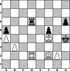 game notation in PGN-format [Event "Lapislazuli"] [Site "www.myChess.de"] [Date "2022.04.10"] [Round "1"] [White "Master1"] [Black "borsti"] [ECO "D00"] [WhitemyELO "1318"] [BlackmyELO "1259"] [Result "1-0"] [TimeControl "10/864000"] [WhiteDays "42"] [BlackDays "60"] [MyChessNo "125233"] 1. d4 d5 2. e3 Nf6 3. Bd3 Bg4 4. Nf3 e6 5. O-O Bd6 6. Nbd2 O-O 7. Re1 a6 8. e4 Bb4 9. c3 Ba5 10. e5 Nfd7 11. h3 Bxf3 12. Nxf3 Bb6 13. Bf4 f5 14. Ng5 Qe7 15. Qh5 h6 16. Nf3 Qf7 17. Qxf7+ Rxf7 18. a4 a5 19. b3 c5 20. Bb5 Nf8 21. Be3 Ng6 22. dxc5 Bc7 23. Nd4 Re7 24. c6 b6 25. Nf3 Bxe5 26. Nxe5 Nxe5 27. Bf4 Nd3 28. Bxd3 Nxc6 29. Bd6 Ree8 30. Bb5 Rac8 31. Ba6 Ra8 32. Bb5 Rac8 33. f4 Red8 34. Rxe6 Kf7 35. Rae1 Rd7 36. c4 d4 37. c5 Ra7 38. Bxc6 Rxc6 39. Re7+ Rxe7 40. Rxe7+ Kf6 41. Re5 bxc5 42. Bxc5 d3 43. Kf2 g5 44. Bd4 d2 45. Re2+ Kg6 46. Rxd2 gxf4 47. Kf3 Kg5 48. h4+ Kxh4 49. Kxf4 Rd6 50. Bf2+ 1-0 position notation in FEN-format 8/8/3r3p/p4p2/P4K1k/1P6/3R1BP1/8 - - - 2 50 Captured white pieces: Captured black pieces: Click on a captured piece in order to display the desired move!