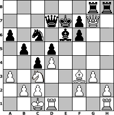 game notation in PGN-format [Event "Dabei ist alles 2"] [Site "www.myChess.de"] [Date "2008.04.04"] [Round "1"] [White "Andylein1989"] [Black "Naunhofer"] [ECO "B40"] [WhitemyELO "1411"] [BlackmyELO "1675"] [Result "0-1"] [TimeControl "10/864000"] [WhiteDays "10"] [BlackDays "10"] [MyChessNo "44055"] 1. e4 c5 2. Nf3 e6 3. Nc3 a6 4. a3 d5 5. exd5 exd5 6. d4 Nf6 7. Bg5 c4 8. Bxf6 gxf6 9. Be2 Rg8 10. g3 Bh3 11. Nh4 Bh6 12. Bf3 Be6 13. Qe2 Kf8 14. Ng2 Nc6 15. Ne3 Bxe3 16. Qxe3 Qd7 17. O-O-O b5 18. Qh6+ Ke7 19. Qxh7 Rh8 20. Qg7 Rag8 0-1 position notation in FEN-format 6rr/3qkpQ1/p1n1bp2/1p1p4/2pP4/P1N2BP1/1PP2P1P/2KR3R - - - 3 21 Captured white pieces: Captured black pieces: Click on a captured piece in order to display the desired move!
