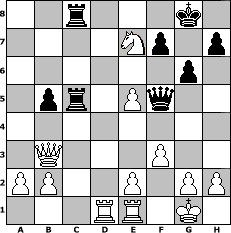 game notation in PGN-format [Event "Drachenboote auf dem Rhein"] [Site "www.myChess.de"] [Date "2009.07.15"] [Round "1"] [White "Greenhorn"] [Black "Seneca"] [ECO "B01"] [WhitemyELO "1612"] [BlackmyELO "1402"] [Result "1-0"] [TimeControl "10/1728000"] [WhiteDays "19"] [BlackDays "16"] [MyChessNo "57478"] 1. e4 d5 2. exd5 Nf6 3. c4 c6 4. d4 cxd5 5. Nc3 e6 6. Nf3 Bb4 7. Bg5 dxc4 8. Bxc4 Be7 9. O-O O-O 10. Qb3 Nc6 11. Rad1 a6 12. Bd3 g6 13. Rfe1 b5 14. Ne4 Nd5 15. Bxe7 Qxe7 16. Nc5 Qf6 17. Be4 Nde7 18. Ne5 Ra7 19. Bxc6 Nxc6 20. Nxc6 Rc7 21. Nb8 e5 22. dxe5 Qf5 23. Nbxa6 Bxa6 24. Nxa6 Rc2 25. f3 Rfc8 26. Nb4 R2c4 27. Nd5 R4c5 28. Ne7+ 1-0 position notation in FEN-format 2r3k1/4Np1p/6p1/1pr1Pq2/8/1Q3P2/PP2P1PP/3RR1K1 - - - 6 28 Captured white pieces: Captured black pieces: Click on a captured piece in order to display the desired move!