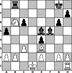 game notation in PGN-format [Event "1000 Jahre Schachdorf Str"] [Site "www.myChess.de"] [Date "2011.08.22"] [Round "1"] [White "Svetlana"] [Black "Peterlie77 (C)"] [ECO "B35"] [WhitemyELO "1729"] [BlackmyELO "1948"] [Result "0-1"] [TimeControl "10/2592000"] [WhiteDays "30"] [BlackDays "12"] [MyChessNo "75674"] 1. e4 c5 2. Nf3 Nc6 3. d4 cxd4 4. Nxd4 g6 5. Nc3 Bg7 6. Be3 Nf6 7. Bc4 O-O 8. Bb3 a5 9. f3 d5 10. Bxd5 Nxd5 11. Nxd5 f5 12. Nxc6 bxc6 13. Nb6 Rb8 14. c3 fxe4 15. Qxd8 Rxd8 16. Rd1 Rxd1+ 17. Kxd1 Bf5 18. f4 e5 19. fxe5 Bxe5 0-1 position notation in FEN-format 1r4k1/7p/1Np3p1/p3bb2/4p3/2P1B3/PP2P1PP/3K3R - - - 0 20 Captured white pieces: Captured black pieces: Click on a captured piece in order to display the desired move!