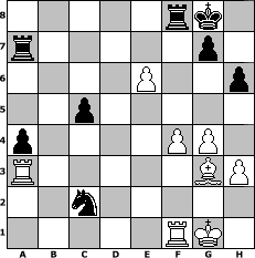 game notation in PGN-format [Event "Fr"] [Site "www.myChess.de"] [Date "2013.03.15"] [Round "1"] [White "Grubengeist"] [Black "deepsabel"] [ECO "C55"] [WhitemyELO "1946"] [BlackmyELO "2005"] [Result "1/2-1/2"] [TimeControl "10/2592000"] [WhiteDays "101"] [BlackDays "107"] [MyChessNo "87058"] 1. e4 e5 2. Nf3 Nc6 3. Bc4 Nf6 4. d3 Be7 5. Nc3 d6 6. h3 Na5 7. Bd5 c6 8. Bxf7+ Kxf7 9. b4 Rf8 10. O-O Kg8 11. a4 Qe8 12. bxa5 Bd8 13. Ne2 Bxa5 14. Ng3 Bd8 15. Rb1 c5 16. Nf5 Bxf5 17. exf5 Nd5 18. Rxb7 Qxa4 19. c4 Qc6 20. Rb3 Nb4 21. g4 a5 22. Ng5 Bxg5 23. Bxg5 h6 24. Bh4 a4 25. Ra3 Ra7 26. Bg3 Qa8 27. f4 e4 28. dxe4 Qxe4 29. Qxd6 Nc2 30. Ra2 Qxc4 31. Qe6+ Qxe6 32. fxe6 Nb4 33. Ra3 Nc2 1/2-1/2 position notation in FEN-format 5rk1/r5p1/4P2p/2p5/p4PP1/R5BP/2n5/5RK1 - - - 3 34 Captured white pieces: Captured black pieces: Click on a captured piece in order to display the desired move!