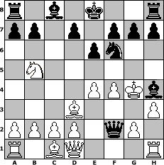 game notation in PGN-format [Event "Human Brain Turnier 2014"] [Site "www.myChess.de"] [Date "2014.06.12"] [Round "1"] [White "muellerh"] [Black "sprinterde"] [ECO "B21"] [WhitemyELO "1571"] [BlackmyELO "1694"] [Result "0-1"] [TimeControl "10/2592000"] [WhiteDays "50"] [BlackDays "55"] [MyChessNo "94783"] 1. e4 c5 2. f4 e6 3. Nf3 Nc6 4. Nc3 Be7 5. h3 Bh4+ 6. Ke2 Nd4+ 7. Nxd4 cxd4 8. Nb5 Qb6 9. Kf3 d3 10. Bxd3 Qf2+ 11. Kg4 Nf6# 0-1 position notation in FEN-format r1b1k2r/pp1p1ppp/4pn2/1N6/4PPKb/3B3P/PPPP1qP1/R1BQ3R - kq - 3 12 Captured white pieces: Captured black pieces: Click on a captured piece in order to display the desired move!