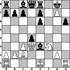 game notation in PGN-format [Event "André Chéron - 30. Todestag"] [Site "www.myChess.de"] [Date "2010.09.12"] [Round "1"] [White "espero"] [Black "muellerh"] [ECO "D00"] [WhitemyELO "1597"] [BlackmyELO "1507"] [Result "1-0"] [TimeControl "10/1728000"] [WhiteDays "36"] [BlackDays "01"] [MyChessNo "68271"] 1. d4 d5 2. Bg5 g6 3. e3 Bg7 4. Nf3 Nf6 5. Nbd2 O-O 6. Bd3 Nc6 7. c3 Re8 8. Ne5 Nxe5 9. dxe5 Nd7 10. e6 fxe6 11. h4 Ne5 12. Bc2 Bf6 13. f4 Nf7 14. h5 Nxg5 15. fxg5 Bxg5 16. hxg6 h6 17. Nf3 Bxe3 18. Qd3 d4 19. g7 1-0 position notation in FEN-format r1bqr1k1/ppp1p1P1/4p2p/8/3p4/2PQbN2/PPB3P1/R3K2R - KQ - 0 19 Captured white pieces: Captured black pieces: Click on a captured piece in order to display the desired move!