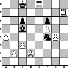 game notation in PGN-format [Event "NoEngine02"] [Site "www.myChess.de"] [Date "2007.11.17"] [Round "2"] [White "commander"] [Black "stierdame1965"] [ECO "D01"] [WhitemyELO "1235"] [BlackmyELO "1051"] [Result "1-0"] [TimeControl "10/1728000"] [WhiteDays "20"] [BlackDays "20"] [MyChessNo "39889"] 1. d4 d5 2. Nc3 Nc6 3. e4 dxe4 4. Nxe4 Nxd4 5. c3 Nf5 6. f4 Be6 7. g4 Nh4 8. Nf3 g5 9. Nfxg5 f6 10. Nxe6 Qd7 11. f5 Rd8 12. Nxd8 Kxd8 13. Nc5 Qxd1+ 14. Kxd1 Nf3 15. Nxb7+ Kd7 16. Bb5+ Kc8 17. Ba6 e5 18. Be3 Bh6 19. Bxa7 Ne7 20. h3 Nc6 21. Bc5 Nb8 22. Be2 e4 23. Na5 Rd8+ 24. Kc2 Rd2+ 25. Kb3 Rxe2 26. Rhe1 Nd2+ 27. Kb4 Na6+ 28. Kb5 Nxc5 29. Rxe2 Nb7 30. a4 Nd6+ 31. Kc5 Nf3 32. Rf1 Nb7+ 33. Nxb7 Kxb7 34. Rd1 Bf8+ 35. Kd5 c6+ 36. Kxe4 Ng5+ 37. Ke3 Nxh3 38. Rd7+ Kc8 39. Rxh7 Bc5+ 40. Kd2 Nf4 41. Re8# 1-0 position notation in FEN-format 2k1R3/7R/2p2p2/2b2P2/P4nP1/2P5/1P1K4/8 - - - 4 41 Captured white pieces: Captured black pieces: Click on a captured piece in order to display the desired move!