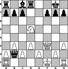 game notation in PGN-format [Event "Schach"] [Site "www.myChess.de"] [Date "2007.12.05"] [Round "1"] [White "TAR"] [Black "ujack1961"] [ECO "C50"] [WhitemyELO "1337"] [BlackmyELO "1768"] [Result "0-1"] [TimeControl "10/864000"] [WhiteDays "00"] [BlackDays "10"] [MyChessNo "40388"] 1. e4 e5 2. Nf3 Nc6 3. Bc4 Bc5 4. Nxe5 Bxf2+ 5. Kxf2 Nxe5 6. Bb3 Qf6+ 7. Kg1 d5 8. Bxd5 Ng4 9. Qf3 Qb6+ 10. Kf1 N8f6 11. h3 Nxd5 12. exd5 Nf6 13. Nc3 O-O 14. b3 Rd8 15. Bb2 Qd4 16. d3 Nxd5 17. Nxd5 Qxb2 0-1 position notation in FEN-format r1br2k1/ppp2ppp/8/3N4/8/1P1P1Q1P/PqP1P1P1/R4K1R - - - 0 18 Captured white pieces: ![]() ![]() ![]() ![]() ![]() ![]() ![]() ![]() ![]() ![]() ![]() ![]() ![]() ![]() ![]() Captured black pieces: ![]() ![]() ![]() ![]() ![]() ![]() ![]() ![]() ![]() ![]() ![]() ![]() ![]() ![]() ![]() Click on a captured piece in order to display the desired move!