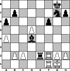 game notation in PGN-format [Event "Svetlana Open 2012"] [Site "www.myChess.de"] [Date "2012.03.22"] [Round "1"] [White "kari6katz"] [Black "Grubengeist"] [ECO "B07"] [WhitemyELO "1758"] [BlackmyELO "1895"] [Result "0-1"] [TimeControl "10/2592000"] [WhiteDays "30"] [BlackDays "29"] [MyChessNo "80765"] 1. e4 d6 2. d4 Nf6 3. f3 g6 4. Bd3 Bg7 5. Be3 O-O 6. Nc3 Nbd7 7. Nge2 e5 8. O-O Re8 9. d5 c6 10. Bc4 Nb6 11. Bb3 cxd5 12. exd5 e4 13. Nd4 Bd7 14. a4 Rc8 15. Ndb5 exf3 16. Qxf3 Bf5 17. Bf4 Nc4 18. Bxc4 Rxc4 19. Nxd6 Rxf4 20. Qxf4 Nh5 21. Qb4 Bf8 22. Ncb5 Re4 23. Qa3 Qb6+ 24. Rf2 Re3 25. Qb4 a6 26. Qd4 Qxd4 27. Nxd4 Bxd6 28. Nxf5 gxf5 29. Rxf5 Ng7 30. Rf6 Be5 31. Rf3 Re2 32. Raf1 f6 33. R3f2 Bd4 0-1 position notation in FEN-format 6k1/1p4np/p4p2/3P4/P2b4/8/1PP1rRPP/5RK1 - - - 2 34 Captured white pieces: ![]() ![]() ![]() ![]() ![]() ![]() ![]() ![]() ![]() ![]() ![]() ![]() ![]() ![]() ![]() Captured black pieces: ![]() ![]() ![]() ![]() ![]() ![]() ![]() ![]() ![]() ![]() ![]() ![]() ![]() ![]() ![]() Click on a captured piece in order to display the desired move!