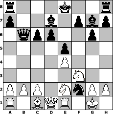 game notation in PGN-format [Event "Mailüfterl"] [Site "www.myChess.de"] [Date "2018.04.23"] [Round "1"] [White "Joschi"] [Black "Helmut48"] [ECO "B56"] [WhitemyELO "1503"] [BlackmyELO "2010"] [Result "0-1"] [TimeControl "10/1728000"] [WhiteDays "40"] [BlackDays "38"] [MyChessNo "112040"] 1. e4 c5 2. Nf3 d6 3. d4 cxd4 4. Nxd4 Nf6 5. Nc3 Nc6 6. Bb5 Bd7 7. O-O g6 8. Re1 Bg7 9. Be3 Ng4 10. Bxc6 bxc6 11. Bc1 Qb6 12. Nce2 e5 13. Nf3 Nxf2 0-1 position notation in FEN-format r3k2r/p2b1pbp/1qpp2p1/4p3/4P3/5N2/PPP1NnPP/R1BQR1K1 - kq - 0 14 Captured white pieces: Captured black pieces: Click on a captured piece in order to display the desired move!