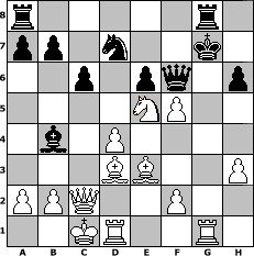 game notation in PGN-format [Event "?"] [Site "www.myChess.de"] [Date "2025.11.01"] [Round "?"] [White "Leon"] [Black "Winston"] [ECO "D02"] [WhitemyELO "2091"] [BlackmyELO "1539"] [Result "1-0"] [TimeControl "10/2592000"] [WhiteDays "87"] [BlackDays "90"] [MyChessNo "133821"] 1. d4 d5 2. Nf3 h6 3. c4 Nf6 4. cxd5 Nxd5 5. e4 Nf6 6. Qc2 Bg4 7. Be3 e6 8. Ne5 c6 9. h3 Bh5 10. g4 Bg6 11. Nxg6 fxg6 12. Nd2 Bb4 13. e5 Kf7 14. exf6 gxf6 15. Bd3 f5 16. O-O-O Qd6 17. Nc4 Qe7 18. Ne5+ Kg7 19. gxf5 Nd7 20. Nxg6 Qf6 21. Rhg1 Rhg8 22. Ne5+ 1-0 position notation in FEN-format r5r1/pp1n2k1/2p1pq1p/4NP2/1b1P4/3BB2P/PPQ2P2/2KR2R1 - - - 4 22 Captured white pieces: Captured black pieces: Click on a captured piece in order to display the desired move!