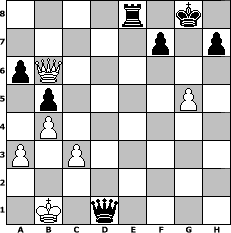 game notation in PGN-format [Event "Sweschnikow II"] [Site "www.myChess.de"] [Date "2012.04.28"] [Round "2"] [White "muellerh"] [Black "Naunhofer"] [ECO "B33"] [WhitemyELO "1429"] [BlackmyELO "1640"] [Result "0-1"] [TimeControl "10/1728000"] [WhiteDays "01"] [BlackDays "20"] [MyChessNo "81328"] 1. e4 c5 2. Nf3 Nc6 3. d4 cxd4 4. Nxd4 Nf6 5. Nc3 e5 6. Ndb5 a6 7. Nd6+ Bxd6 8. Qxd6 Qa5 9. Bd2 Qb4 10. Qxb4 Nxb4 11. O-O-O O-O 12. a3 Nc6 13. Bd3 b5 14. b4 Nd4 15. Be3 Ne6 16. Rhf1 Bb7 17. f4 Ng4 18. Rf3 Nxe3 19. Rxe3 Nxf4 20. g3 Ng6 21. h4 Rac8 22. Kb2 Ne7 23. Be2 Rc7 24. Bg4 Rd8 25. Red3 Bc6 26. Bh3 Kf8 27. Nd5 Bxd5 28. exd5 d6 29. Rf3 g6 30. g4 Rc4 31. g5 Rxh4 32. Rdf1 Nf5 33. Bxf5 gxf5 34. Rxf5 Rd7 35. Rg1 Rd4 36. Rh1 Kg7 37. Rf6 Rg4 38. Rhh6 e4 39. Rxd6 Rxd6 40. Rxd6 e3 41. Rd8 Re4 42. d6 e2 43. d7 e1=Q 44. Rg8+ Kxg8 45. d8=Q+ Re8 46. Qb6 Qe5+ 47. c3 Qe2+ 48. Kb1 Qd1+ 0-1 position notation in FEN-format 4r1k1/5p1p/pQ6/1p4P1/1P6/P1P5/8/1K1q4 - - - 3 49 Captured white pieces: Captured black pieces: Click on a captured piece in order to display the desired move!